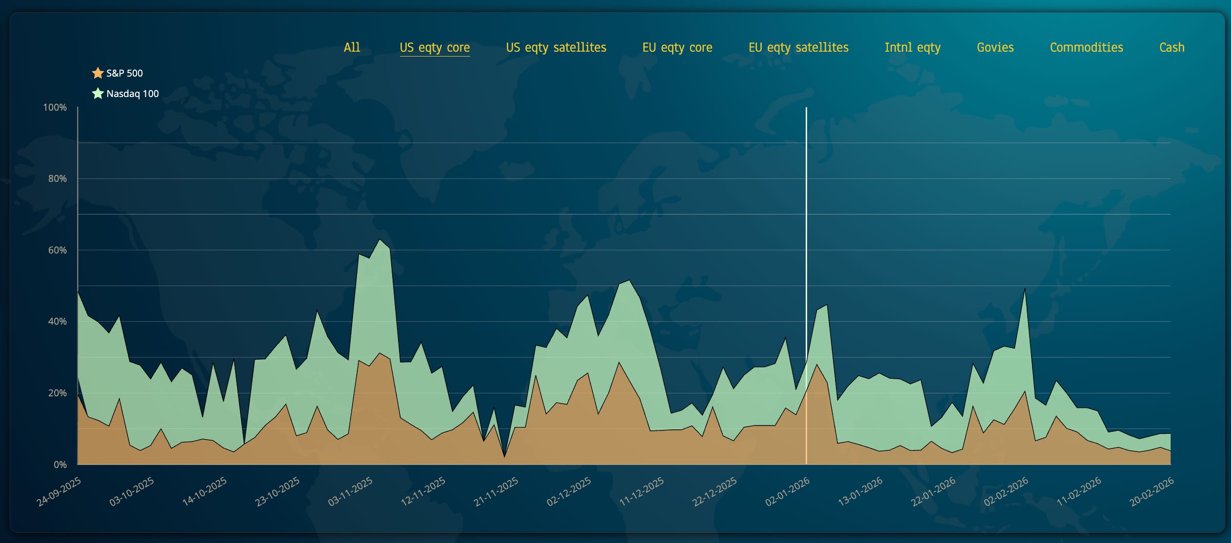 The comparison would be misleading. Depending on market conditions we might win or lose easily week-in, week-out. Aims, portfolio shape, behaviors are really different. We have different aims: we do control drawdowns, while the static mix 60/40 does not. See how much we have changed shape to protect you at all times - to limit drawdowns.