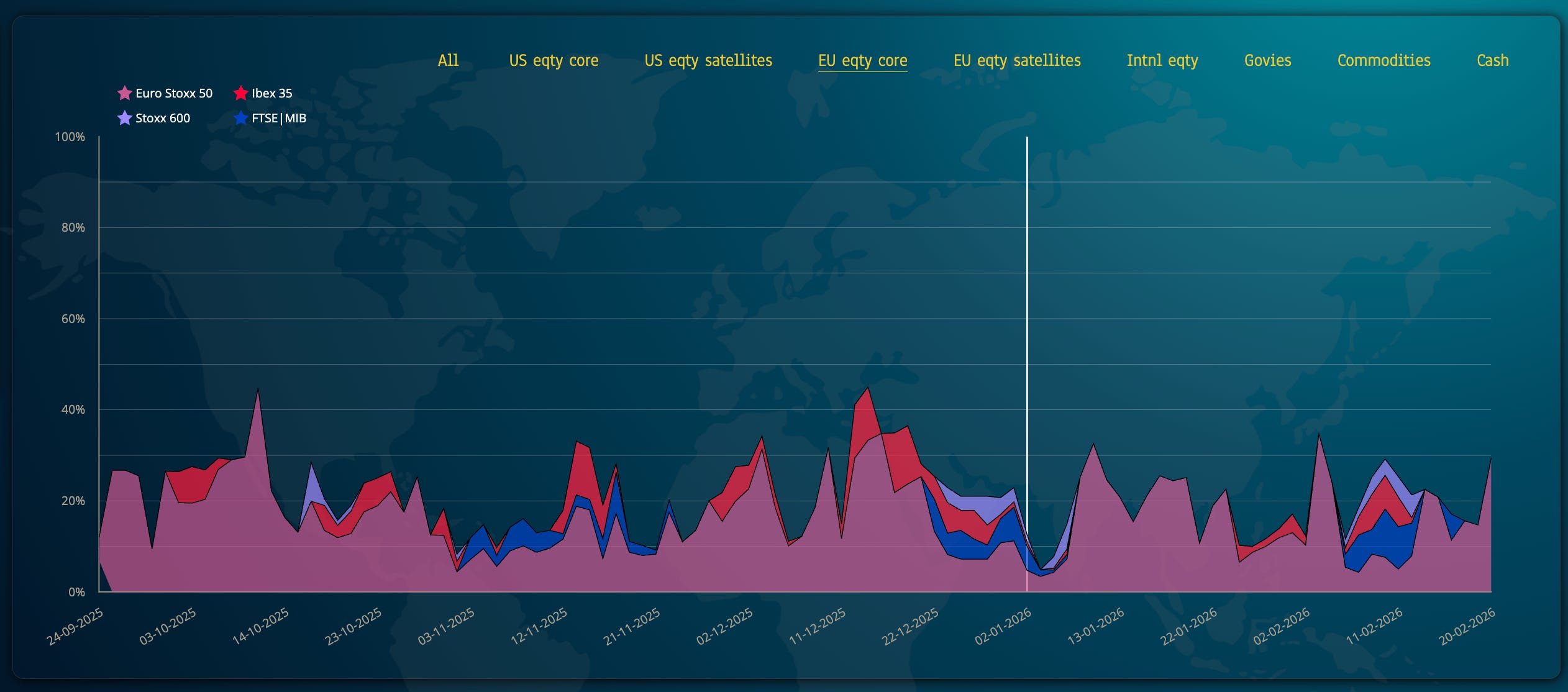 European indices, positive but bumpy, have averaged 20% of the portfolio in 2026