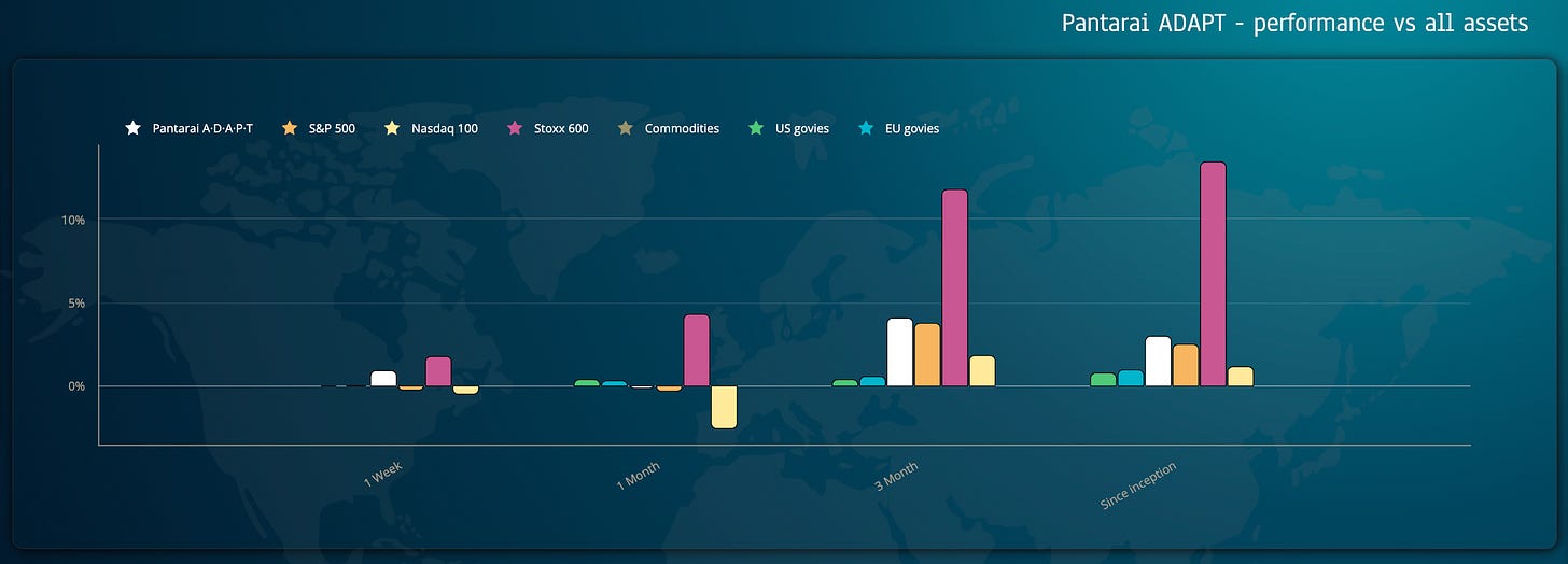 Pantarai ADAPT is the white line, over-performing every individual major “Beta” basket we trade with the exception of EU stocks, which are a contributor to our portfolio but we own them within a limit. In more detail, for Pantarai ADAPT:
